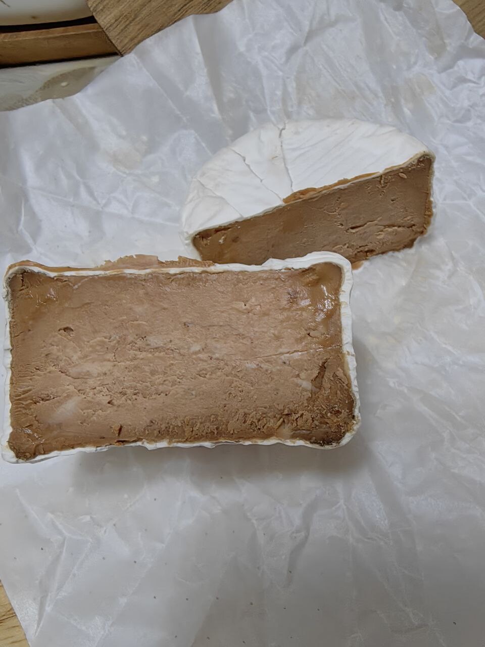 - Корочка: тонкая и морщинистая. Слой плесени очень тонкий, часто бывают коричневые полосы или залысины.